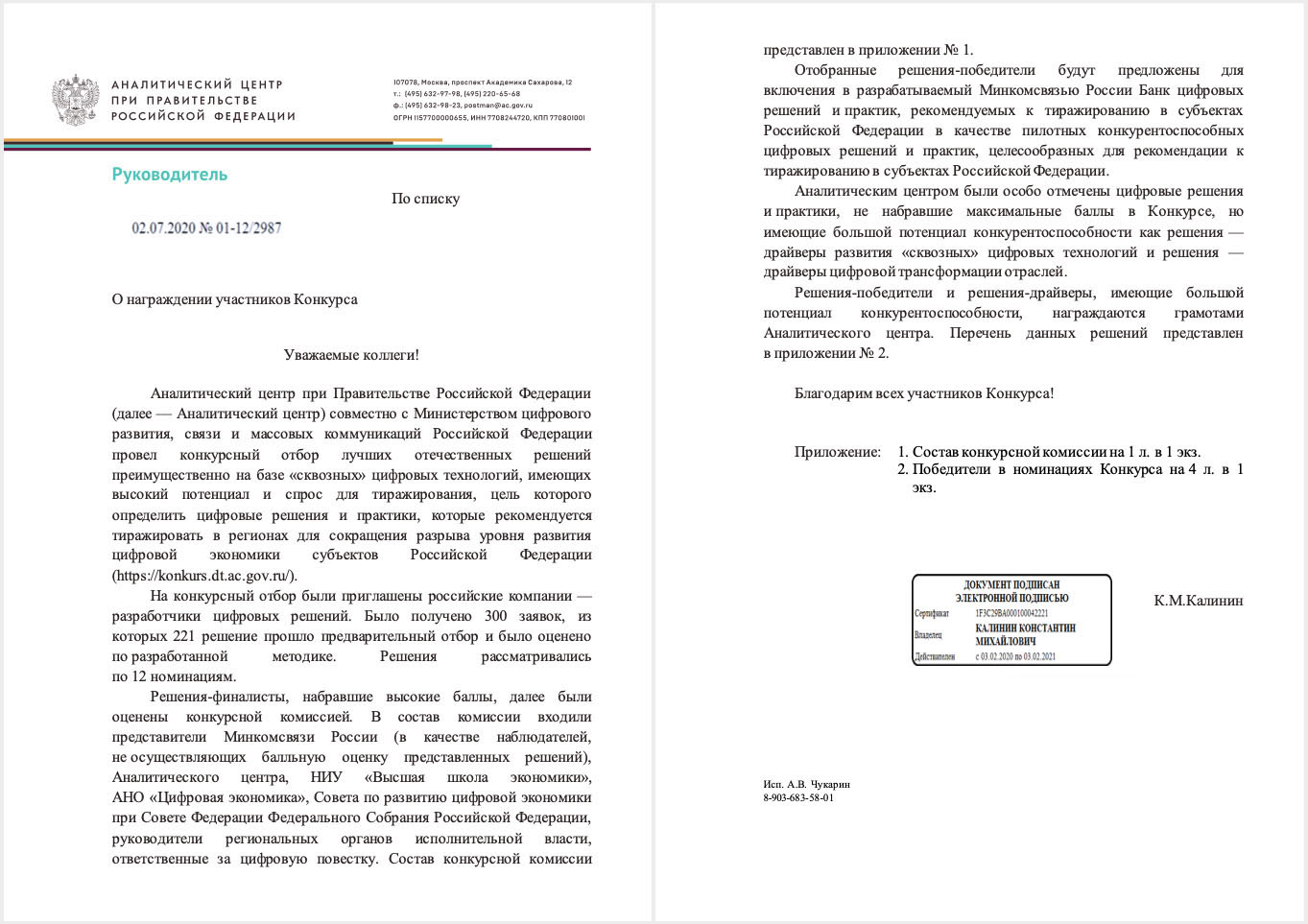 Конкурсный отбор лучших отечественных решений проводился по заказу Минкомсвязи России среди ПО, созданного преимущественно на базе «сквозных» цифровых технологий, имеющего высокий конкурентный потенциал и спрос для тиражирования в субъектах Российской Федерации.